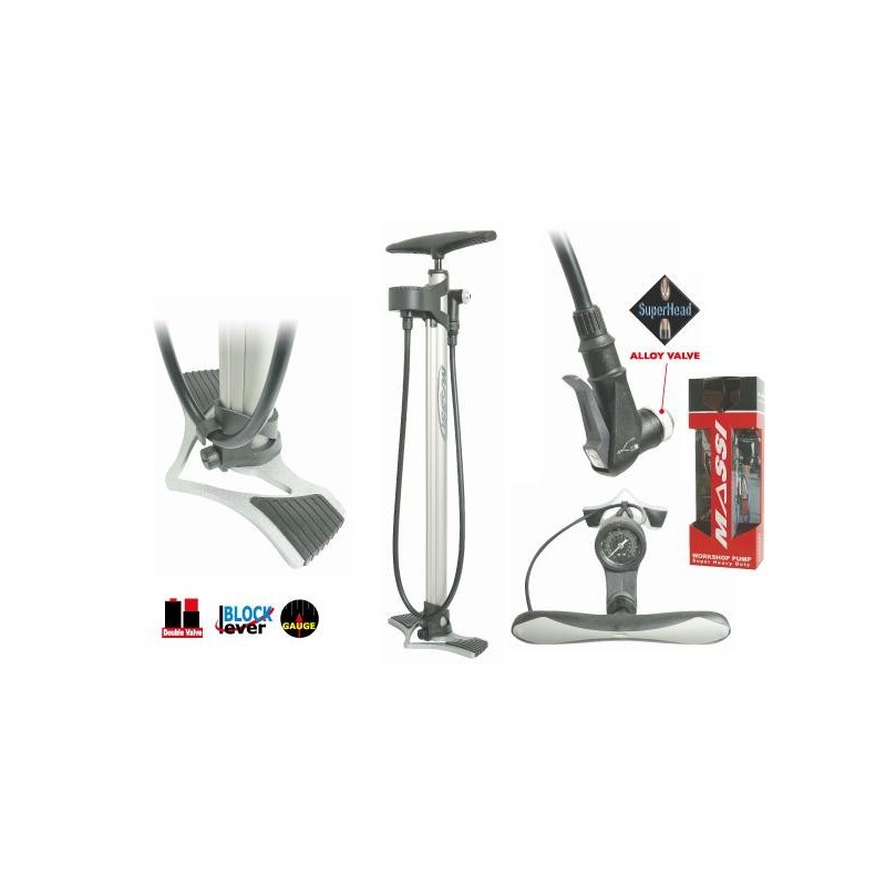 Compatible con válvula presta y schrader, goza de gran estbilidad por la ergonomía del soporte para apoyar los pies. Consta de un manómetro grande incorporado
