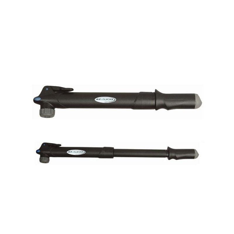 Bomba con Cuerpo plástico reforzado y terminación en aluminio. Para válvula presta y Schrader. Presión máx 80 psi-longitud 260mm-Soporte velcro para fijar