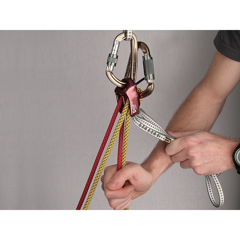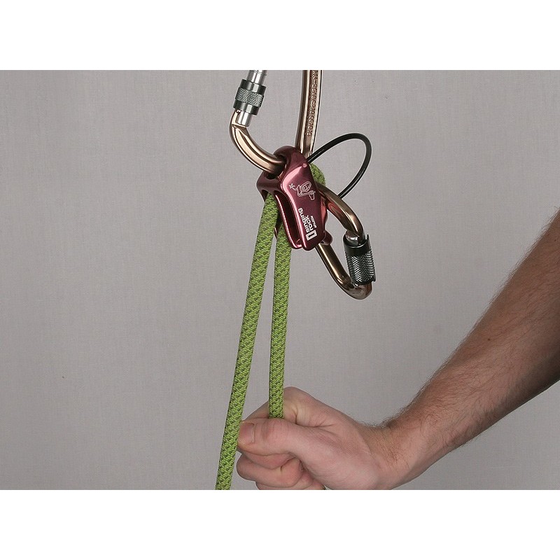 Cuando estás asegurando desde arriba, el "modo de guía" le permite manejarse con un cordino o una cinta para liberar el dispositivo. Permite también asegurar a dos escaladores al mismo tiempo.