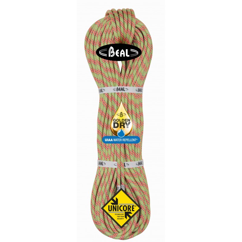 La cuerda Beal Ice line con tratamiento Golden Dry es una cuerda pensada en su uso para glaciares y alpinistas expertos gracias a su gran fluidez y fuerza de choque muy baja.