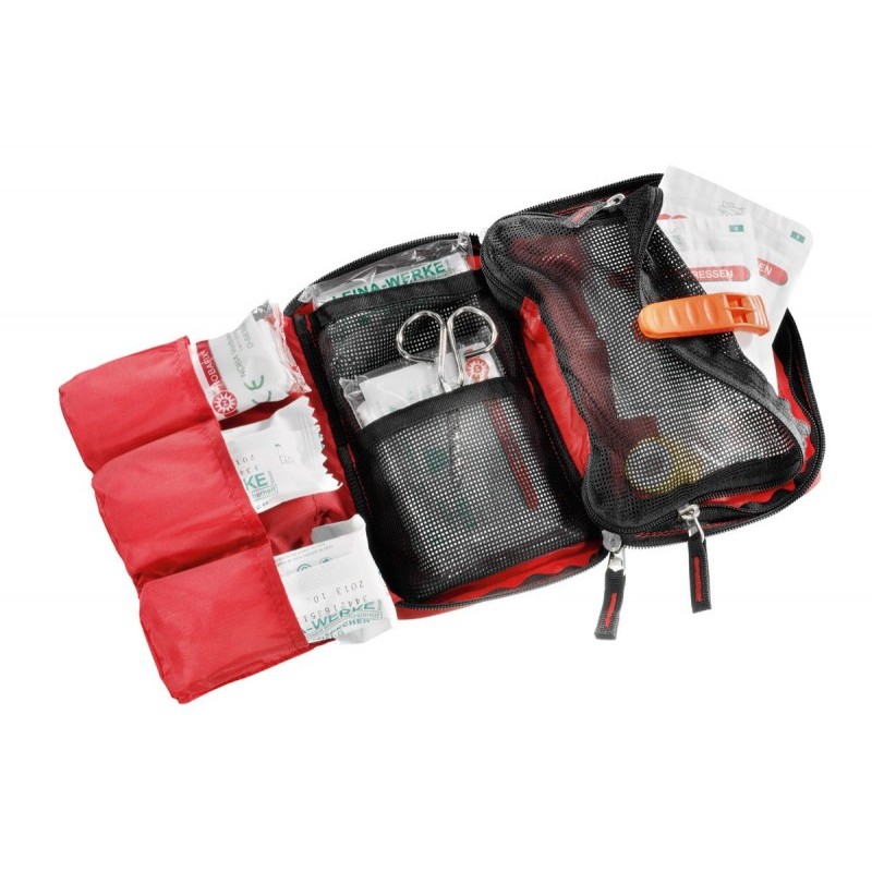 • Con contenido completo para primera curación: Tijeras, esparadrapo, tiritas, pinzas, guantes, 4 gasas de algodón, sábana térmica, vendaje triangular con 2 imperdibles, 2 rollos de vendaje, toallitas de alcohol